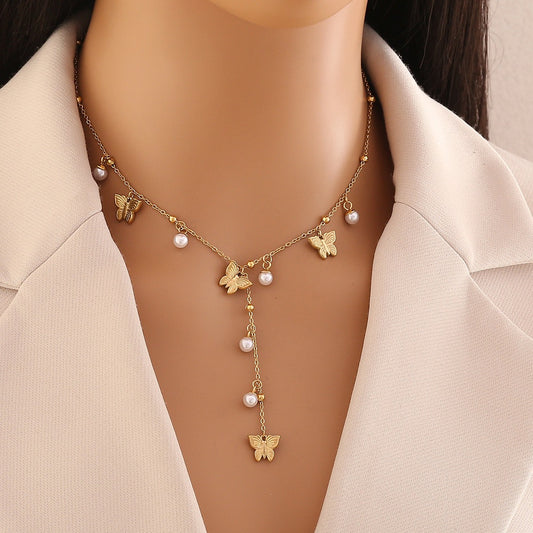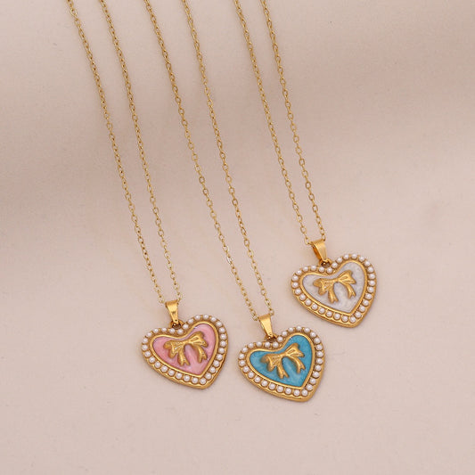Vintage Heart & Pearl Bow Stainless Steel Necklace
