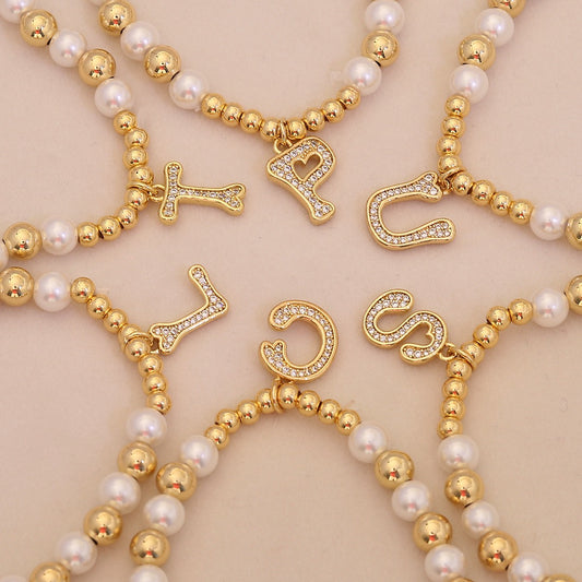 Faux Pearl Beaded Bracelet with Gold Beetle Charm