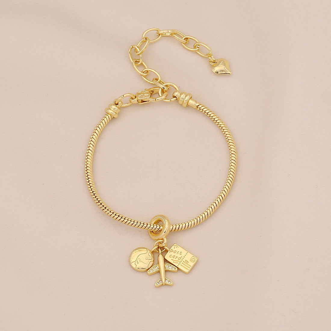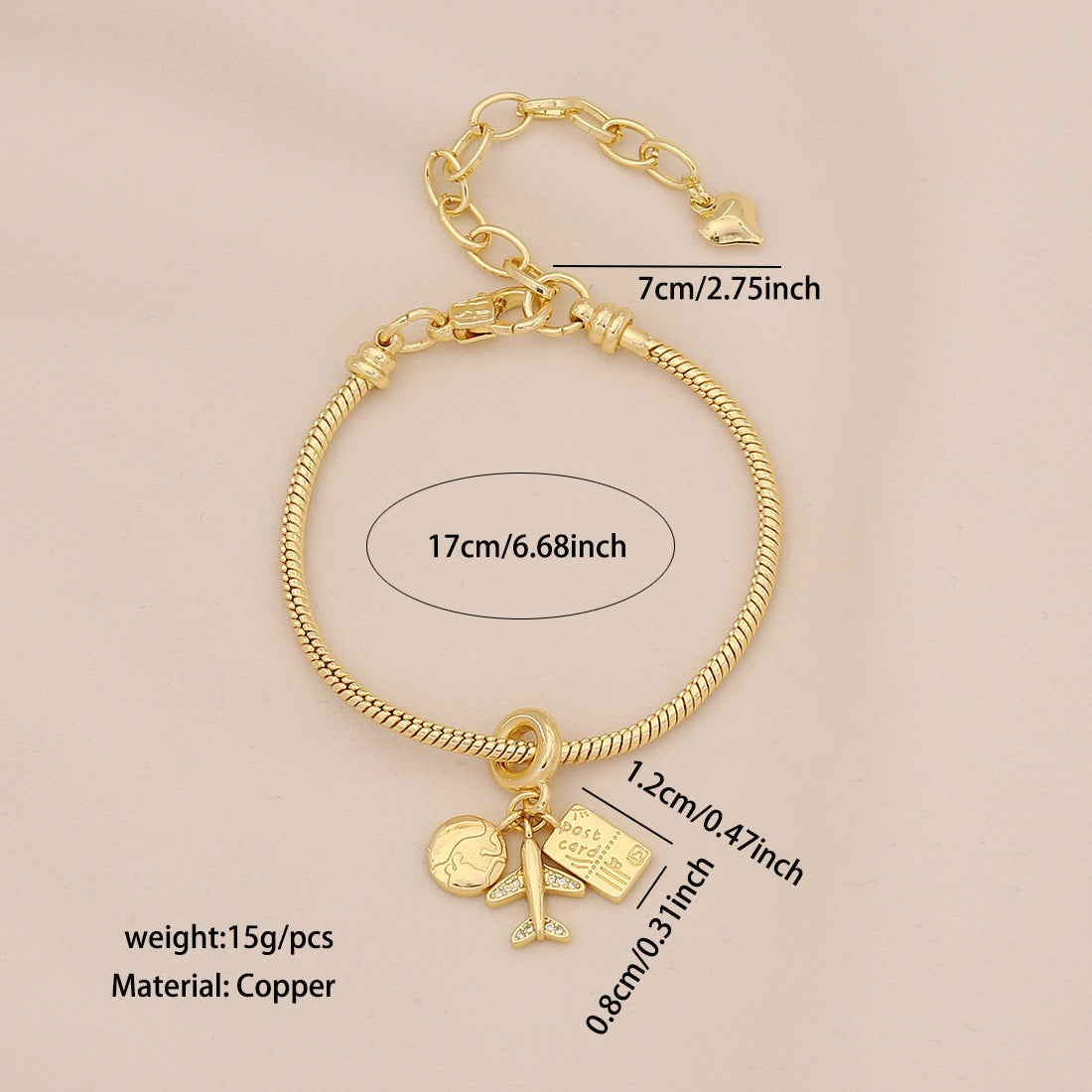 - Unique charms including an airplane, suitcase, and Earth