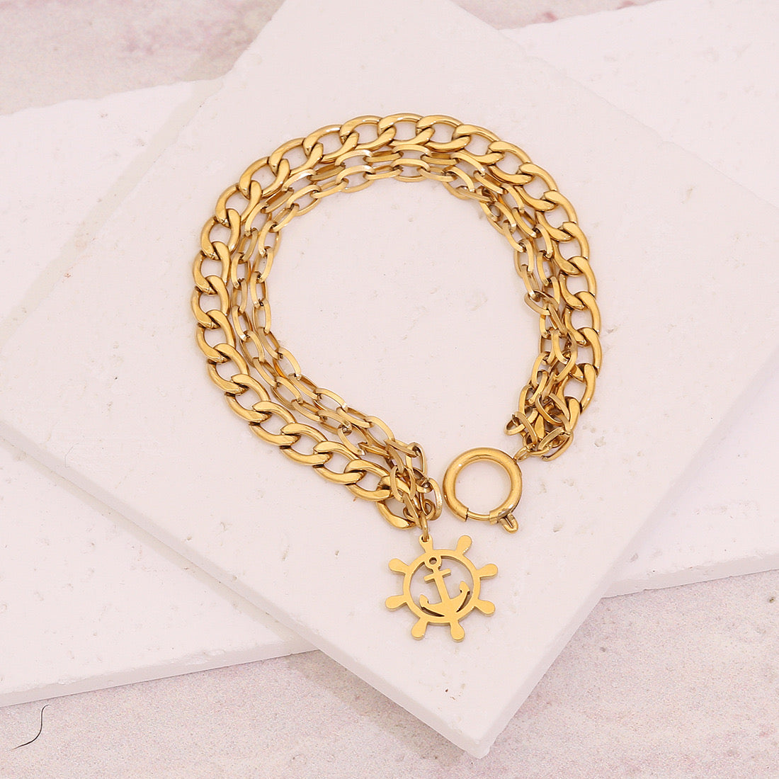 Make waves with the Triple Layer Titanium Steel Bracelet, featuring ship wheel and anchor pendants. This robust yet stylish piece brings a nautical touch to your accessories, perfect for any adventure.